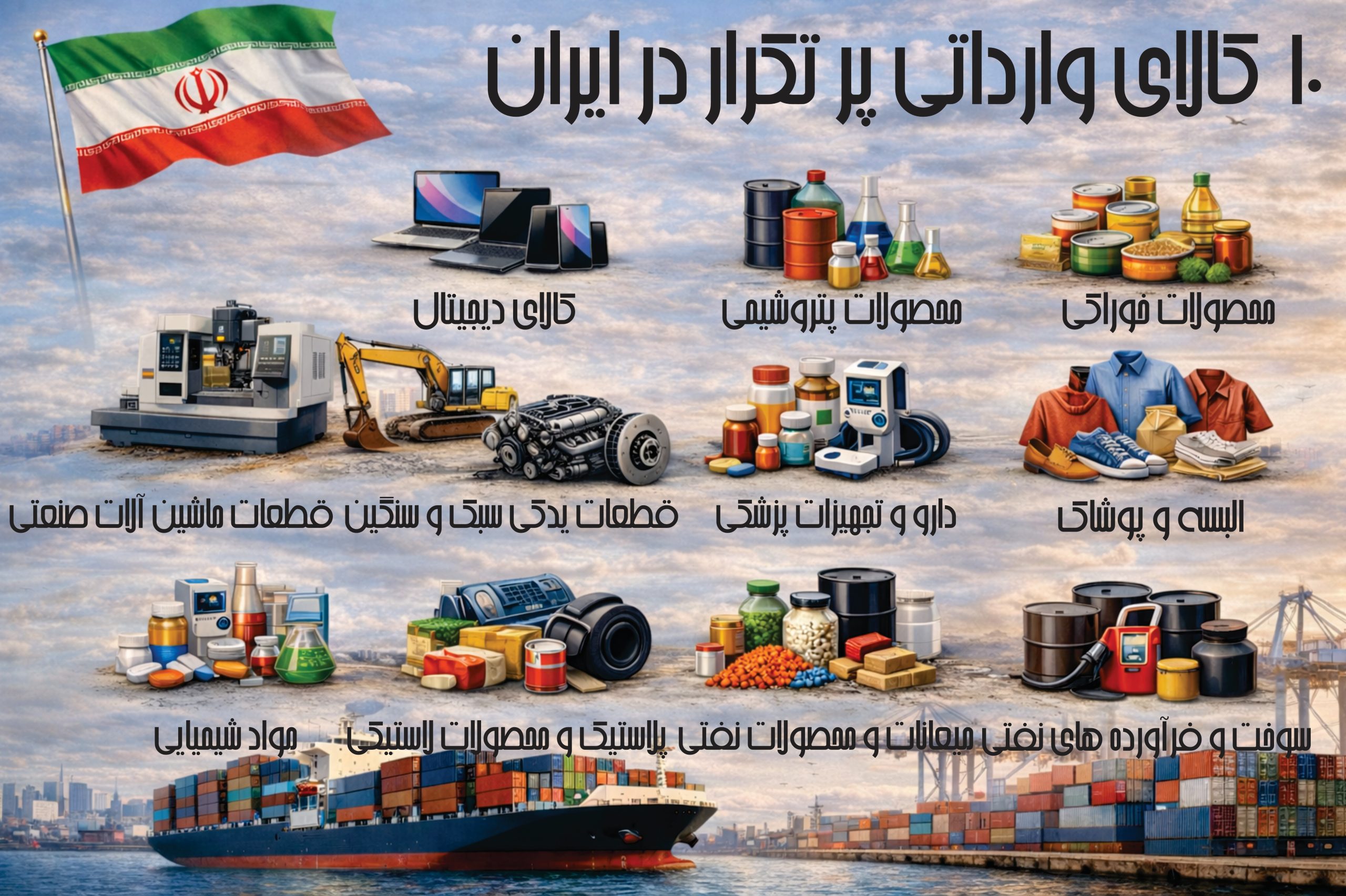 کالاهای الکترونیکی و دیجیتال گوشی موبایل، تبلت، لپتاپ، قطعات کامپیوتری علت واردات بالا: نیاز روزافزون بازار و محدودیت تولید داخلی ماشینآلات و تجهیزات صنعتی دستگاههای خط تولید،...